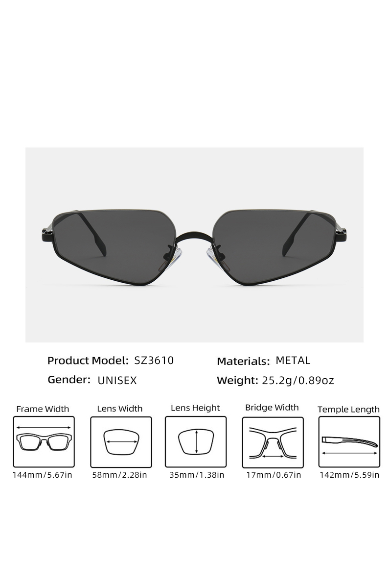 Μεταλλικά γυαλια με μεταλλικούς βραχίωνες, Α’ ποιότητας, υψηλής αισθητικής, ιταλικής κατασκευής. Συνοδεύονται από πανάκι καθαρισμού και σκληρή θήκη για προστασία κατά την μεταφορά. Απορροφητικότητα φακών UV 400, που ακολουθεί την Ευρωπαϊκή οδηγία 89/86/EEC και είναι συμμορφωμένο με το πρότυπο : NF EN:/2005/A1:2007.