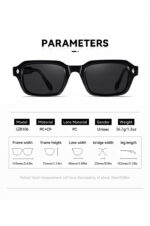 Τετράγωνα πάστινα γυαλιά με πάστινους βραχίωνες, Α’ ποιότητας, υψηλής αισθητικής, ιταλικής κατασκευής. Συνοδεύονται από πανάκι καθαρισμού και σκληρή θήκη για προστασία κατά την μεταφορά. Απορροφητικότητα φακών UV 400, που ακολουθεί την Ευρωπαϊκή οδηγία 89/86/EEC και είναι συμμορφωμένο με το πρότυπο : NF EN:/2005/A1:2007.